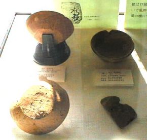 (ぼくしょどき)本郷遺跡(ほんごういせき)から出土した土器 です。 墨(すみ)でいろいろな文字が書かれています。 |